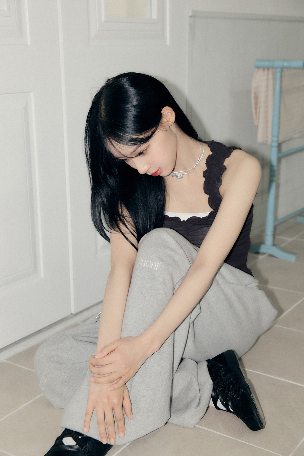 자수가 양 무릎에 포인트로 들어가있어 스타일리시한 무드를 더해주는 아이템입니다.